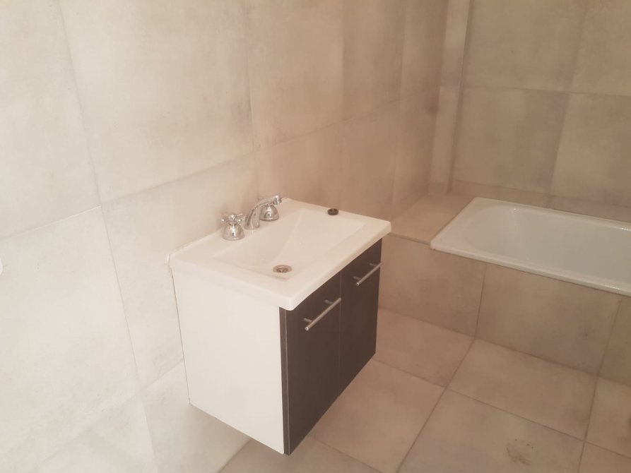 Muebles de cocina bajo mesada enchapados, mesada de granito/inox. con grifería monocomando.