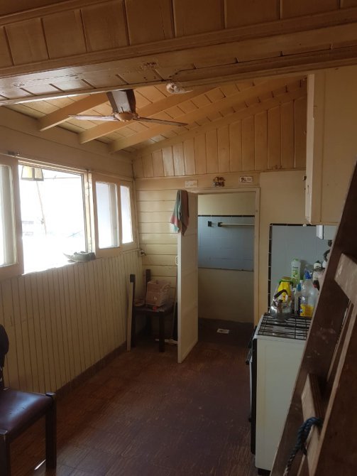 Cocina-comedor: (5,17 x 2,23 m) con piso calcáreo, equipada con bajo mesada de melamina, mesada de acero inoxidable y alacena de madera.