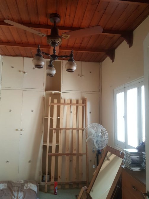 Dormitorio: (3,35 x 2,33 m) con piso de granito, techo de madera y placard de 4 puertas con bauleras.