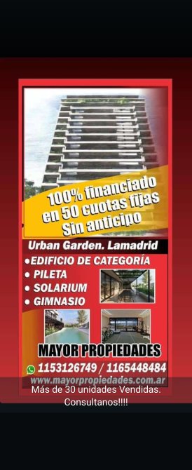 Urban Garden es un exclusivo proyecto inmobiliario ubicado en pleno corazón de Avellaneda, en Lamadrid 40. Este imponente edificio de 15 pisos redefine el concepto de calidad y confort, ofreciendo una variada selección de unidades en venta con opciones de 1, 2, 3 y 4 ambientes, tanto al frente como al contrafrente. Las superficies van desde 32 m² hasta 152 m², diseñadas para adaptarse a diversas necesidades. Todas las unidades incluyen muebles de cocina, bacha, grifería, anafe vitrocerámico y horno eléctrico de alta gama, garantizando una experiencia moderna y sofisticada.